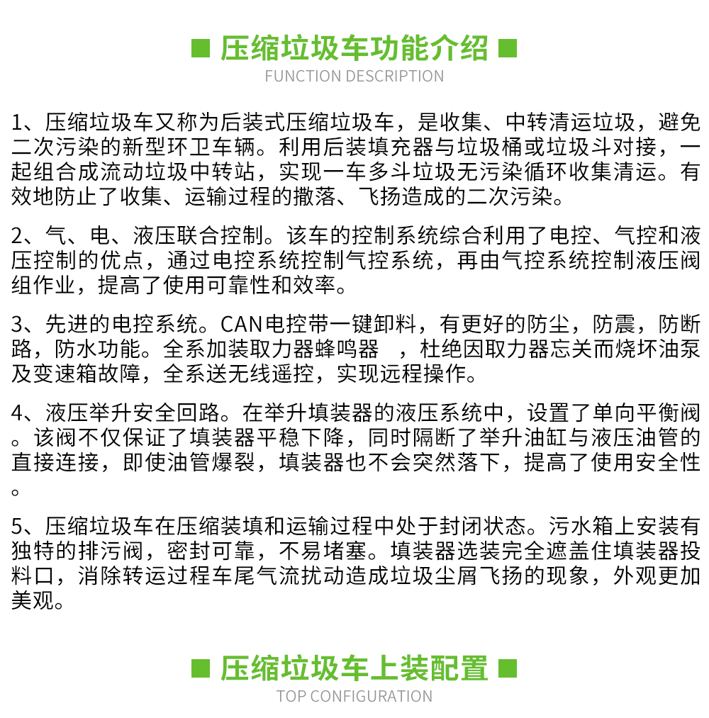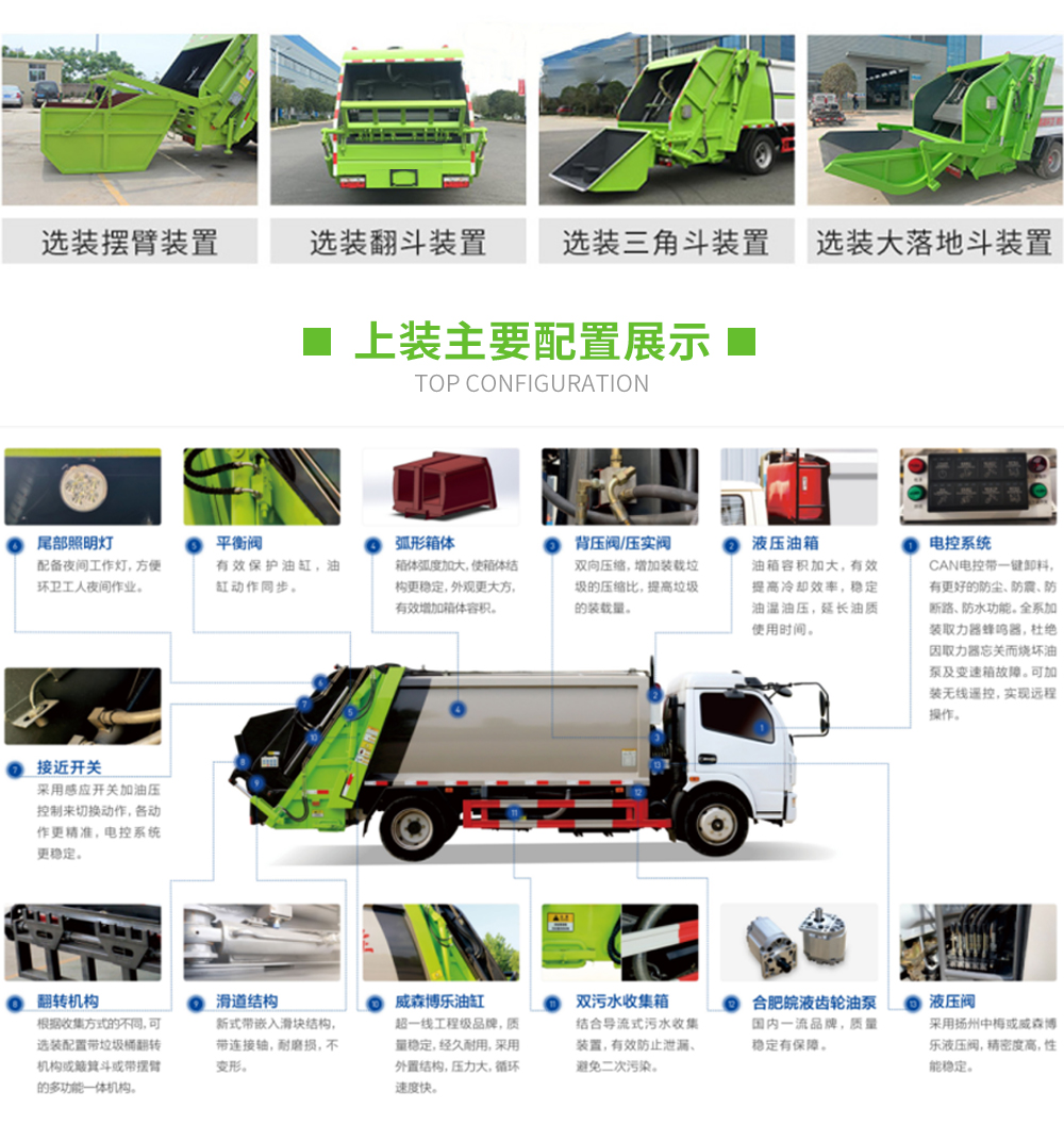 上裝標(biāo)配:優(yōu)質(zhì)高強(qiáng)度Q345錳鋼制作箱體。雙向壓縮結(jié)構(gòu),帶尾部污水箱,威森博樂油缸,英國DLI卡密封圈,威森博樂多路閥,安徽皖液液壓泵,壓實(shí)閥,PLC或CAN電控操作模式,帶駕駛室操作,標(biāo)配垃圾翻轉(zhuǎn)斗或掛桶翻轉(zhuǎn)板。(送無線遙控)